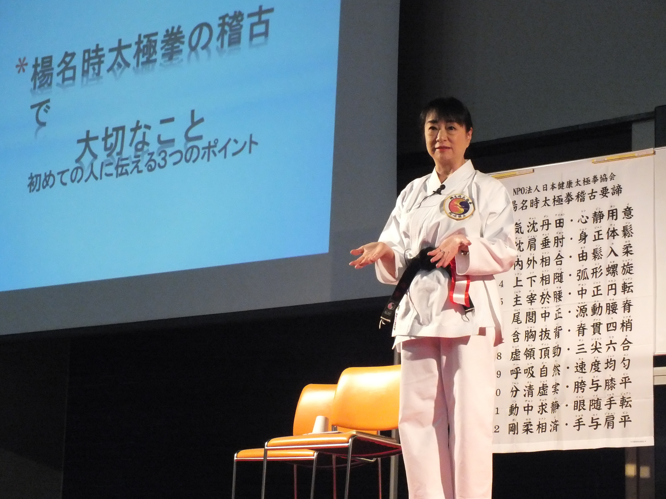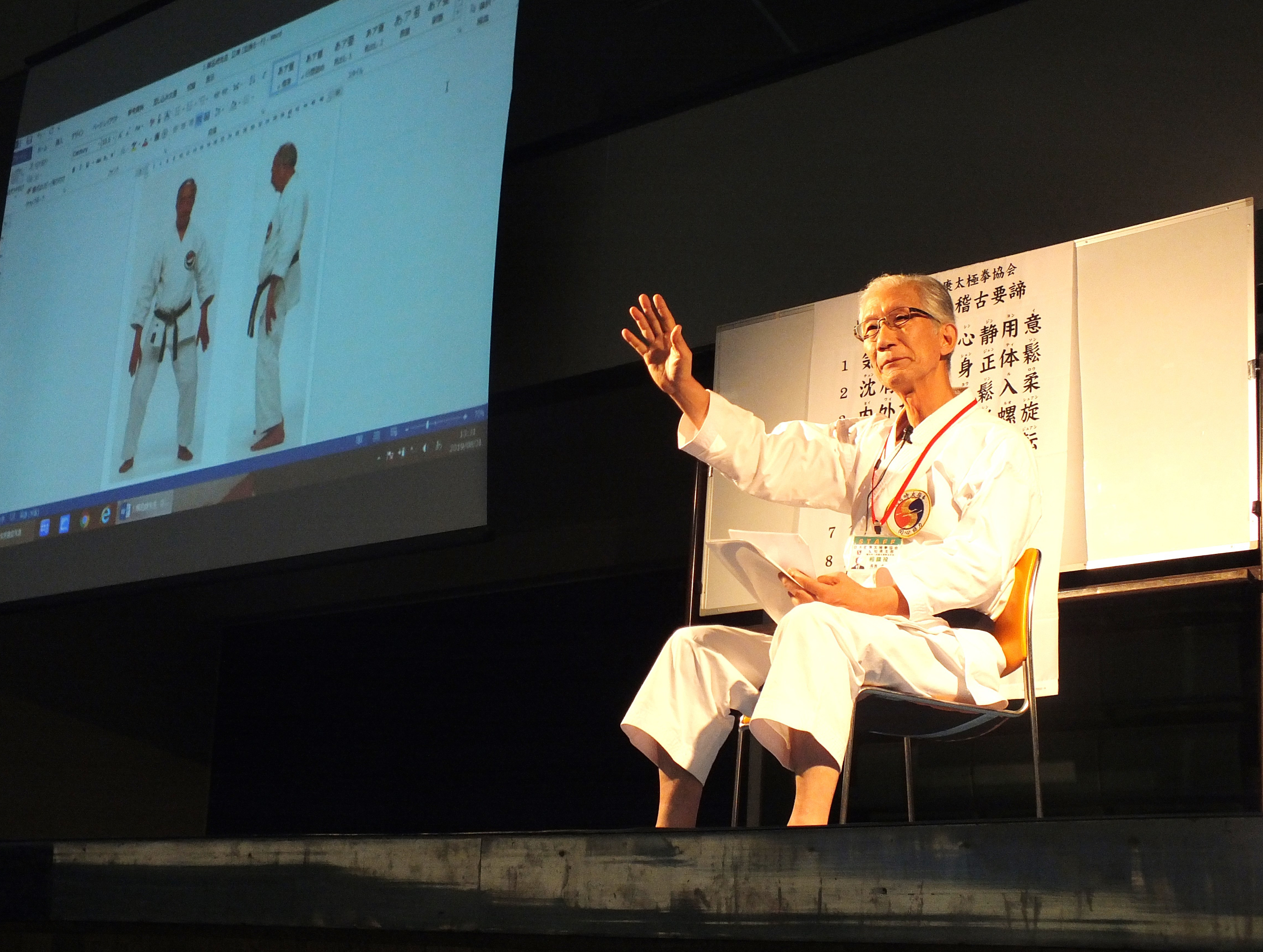 午後は、本部育成研修担当理事・長表師範の講話「楊名時太極拳を学ぶ」、続いて楊慧先生から「指導者としての心構え」についてスクリーンを使って講義していただきました。