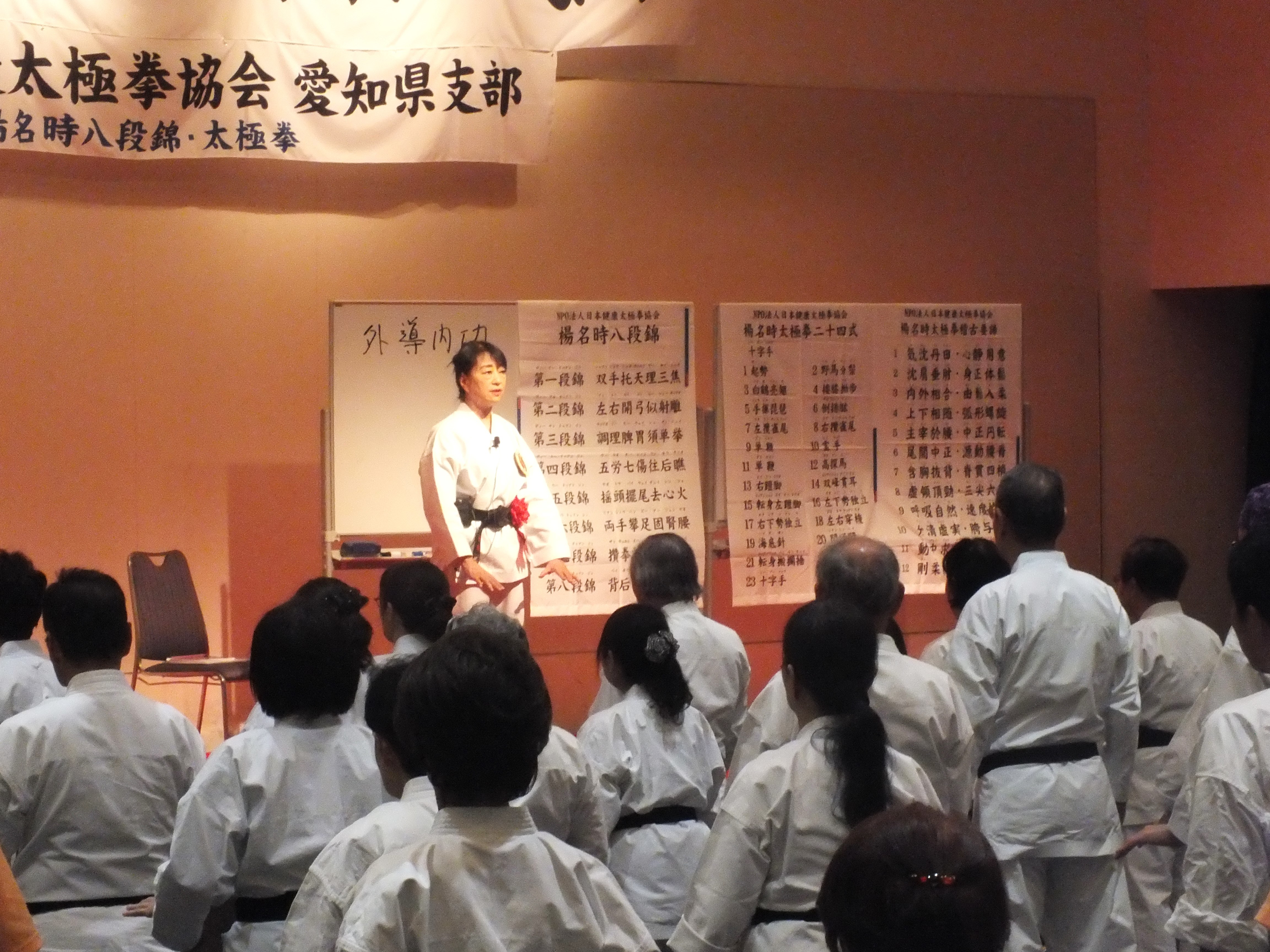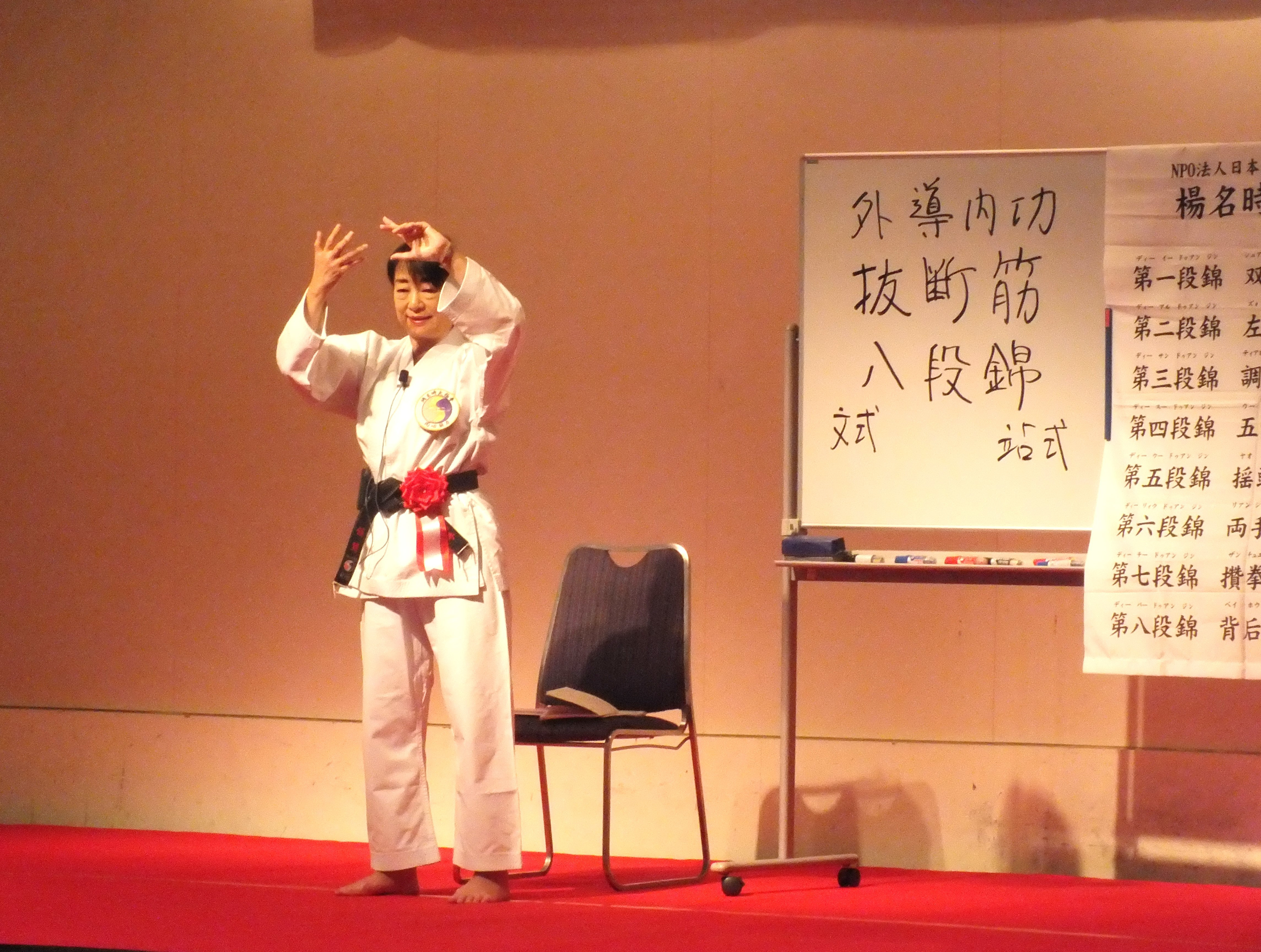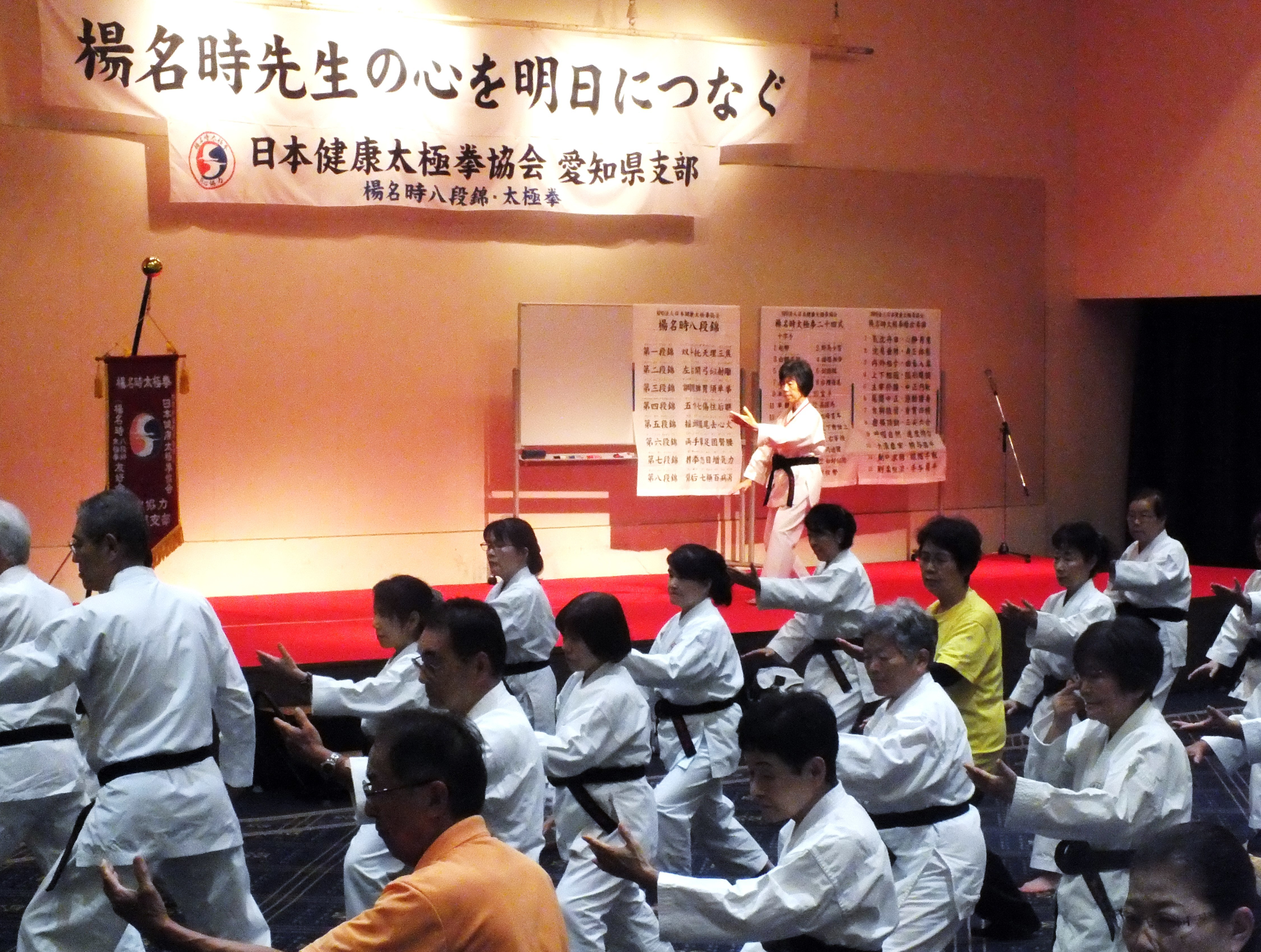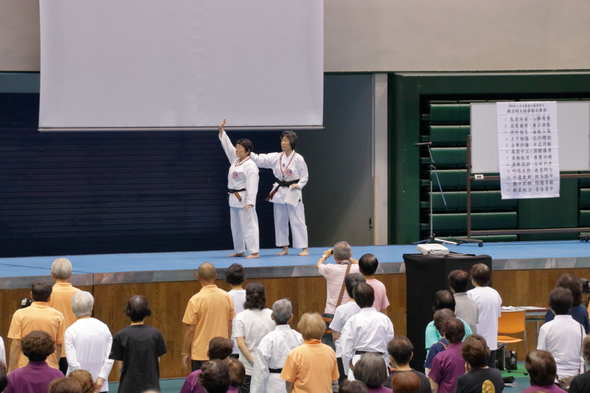 一日目、全体稽古の後、楊慧先生による「楊名時八段錦(その4)」の特別講習会が行われました。今回は第七段錦と第八段錦を、わかりやすく丁寧に解説していただきました。その後教室指導者の演舞があり、最後に全員で「太極之華」を演舞しました。