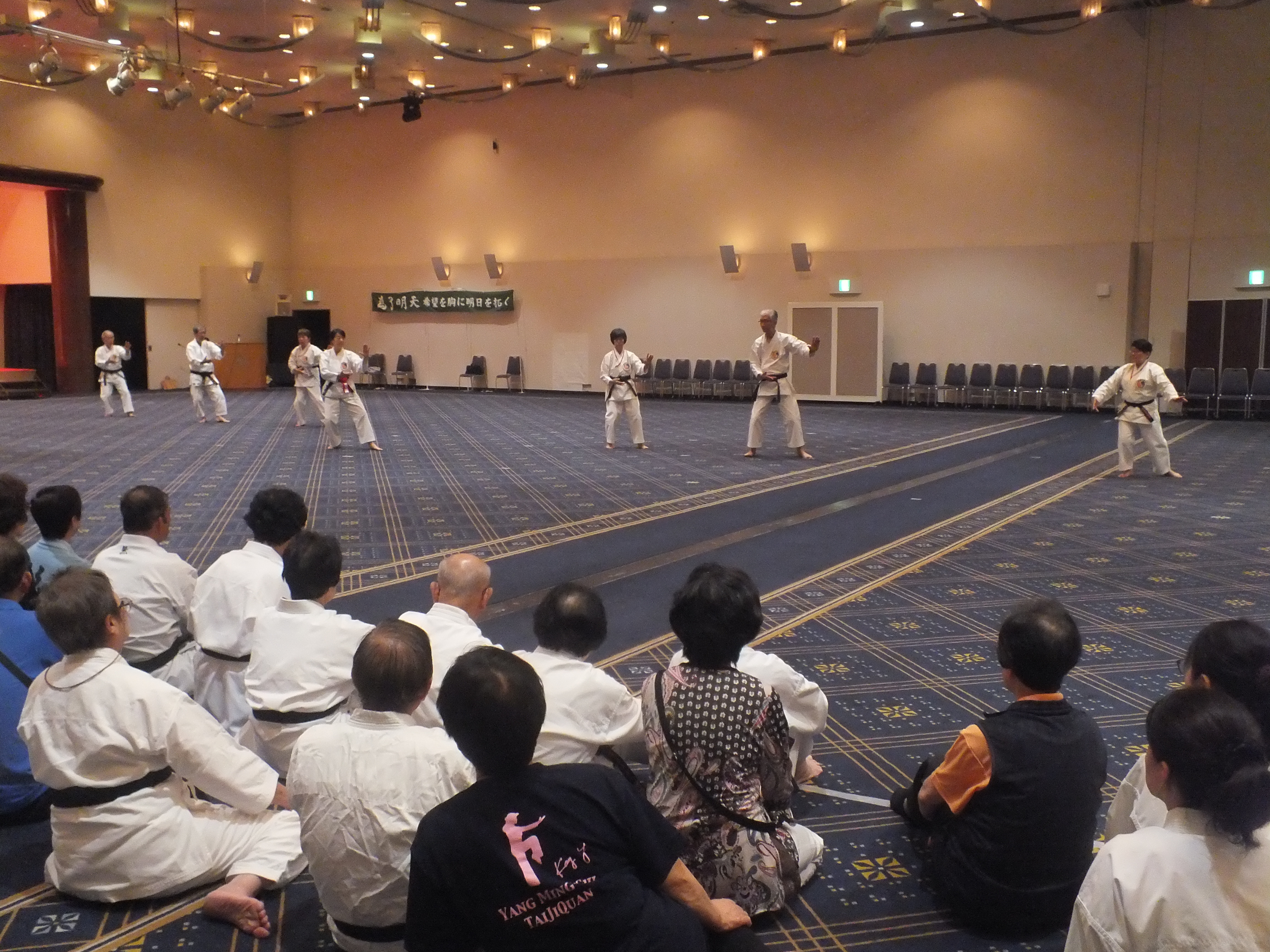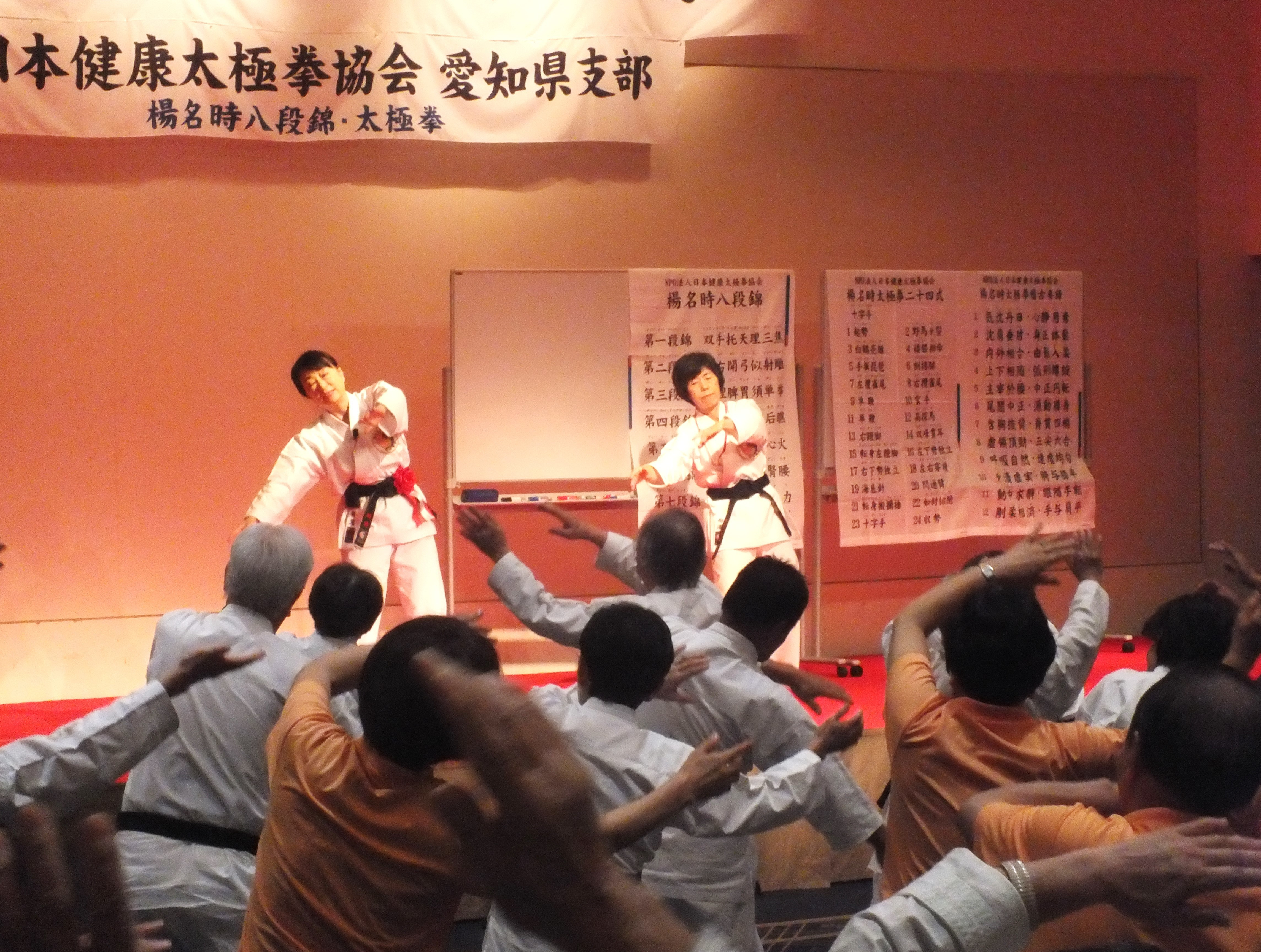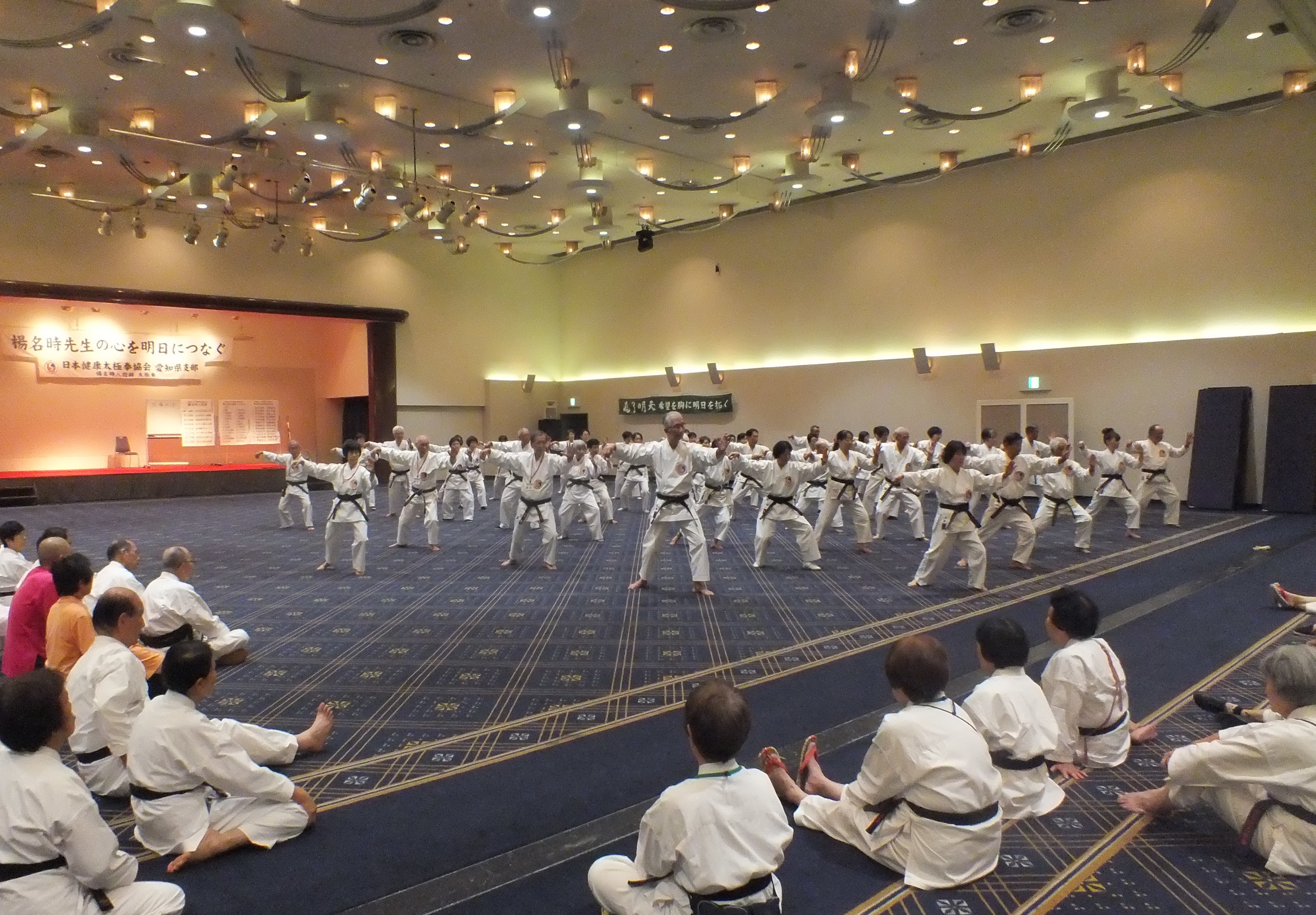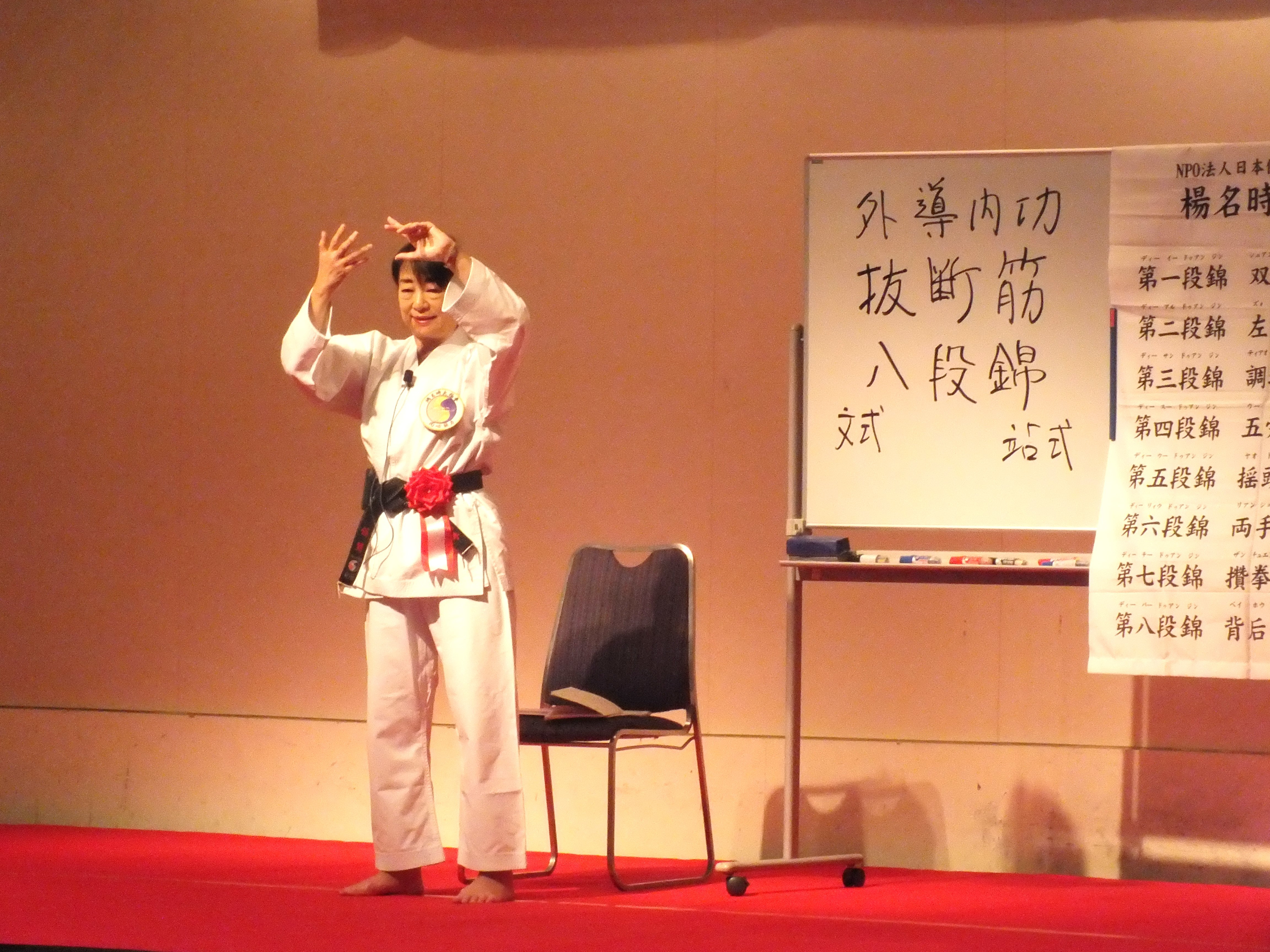 一日目、全体稽古の後、楊慧先生による「楊名時八段錦(その4)」の特別講習会が行われました。今回は第七段錦と第八段錦を、わかりやすく丁寧に解説していただきました。その後教室指導者の演舞があり、最後に全員で「太極之華」を演舞しました。