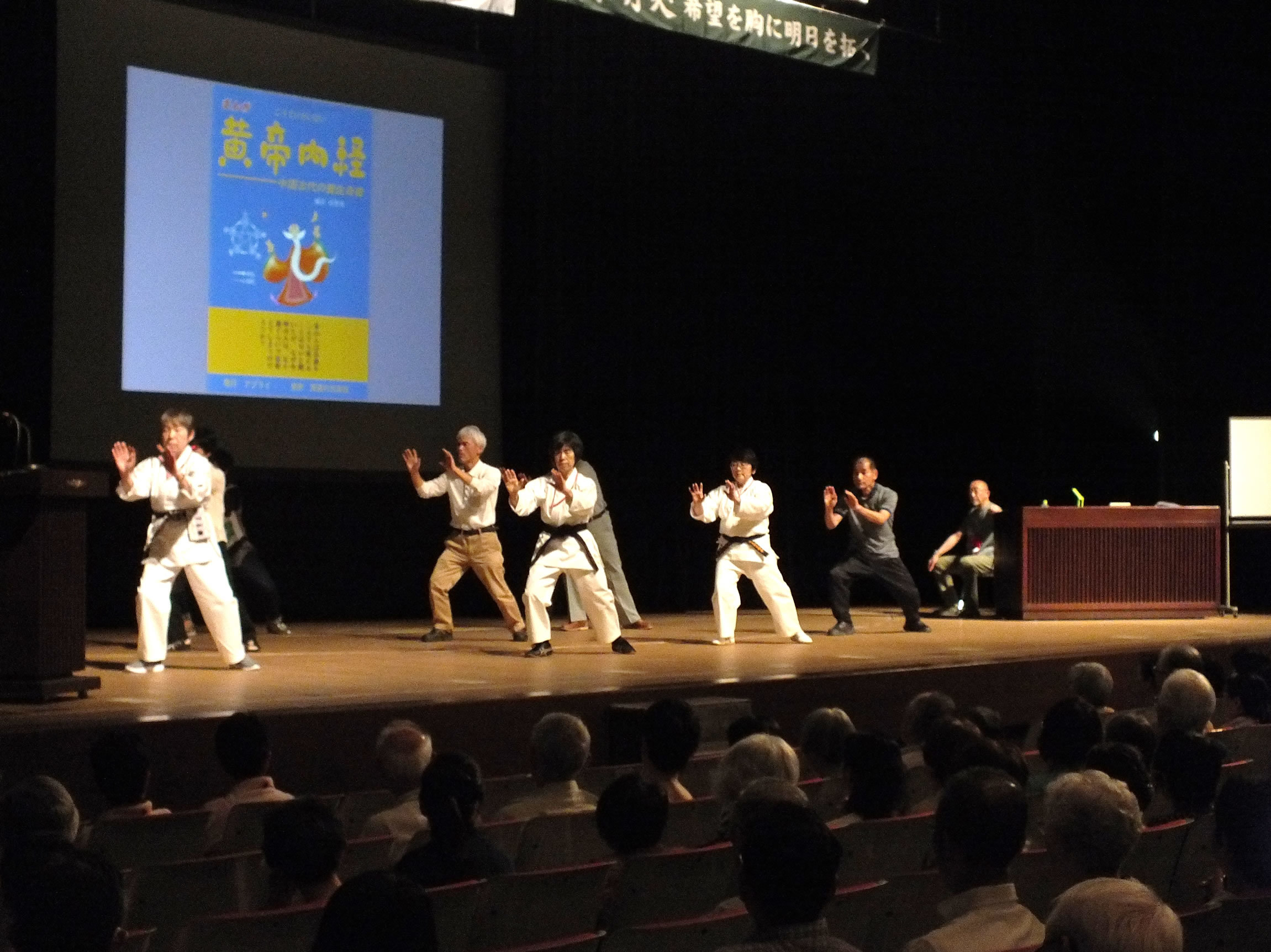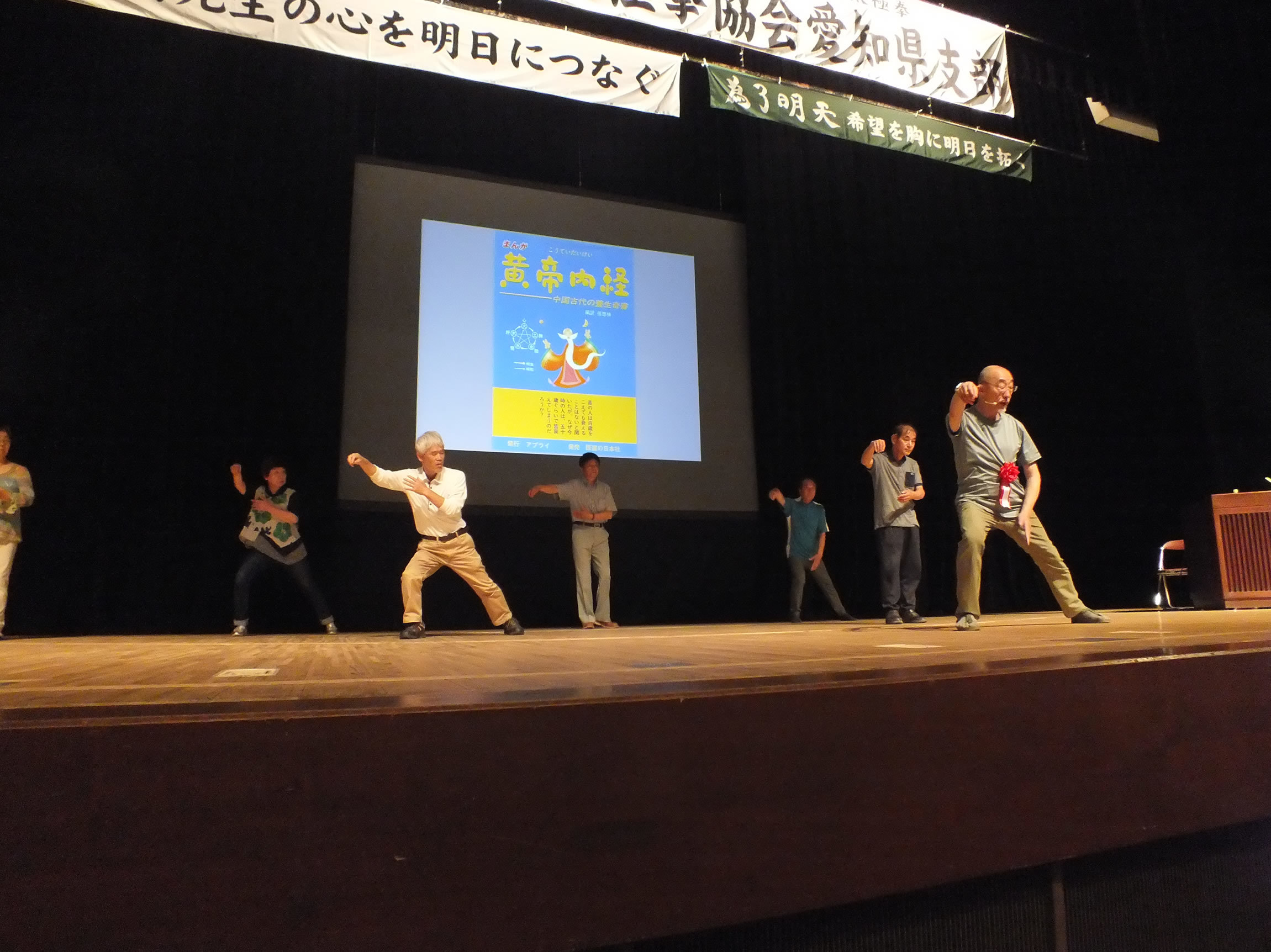 講習の初めに、参加者の中から選ばれた6名の代表と、支部役員3名・助手の方も加わって不老拳演舞がありました。登壇された7名を実技モデルとして、時々理事長の実技を交えながら解説していただきました。