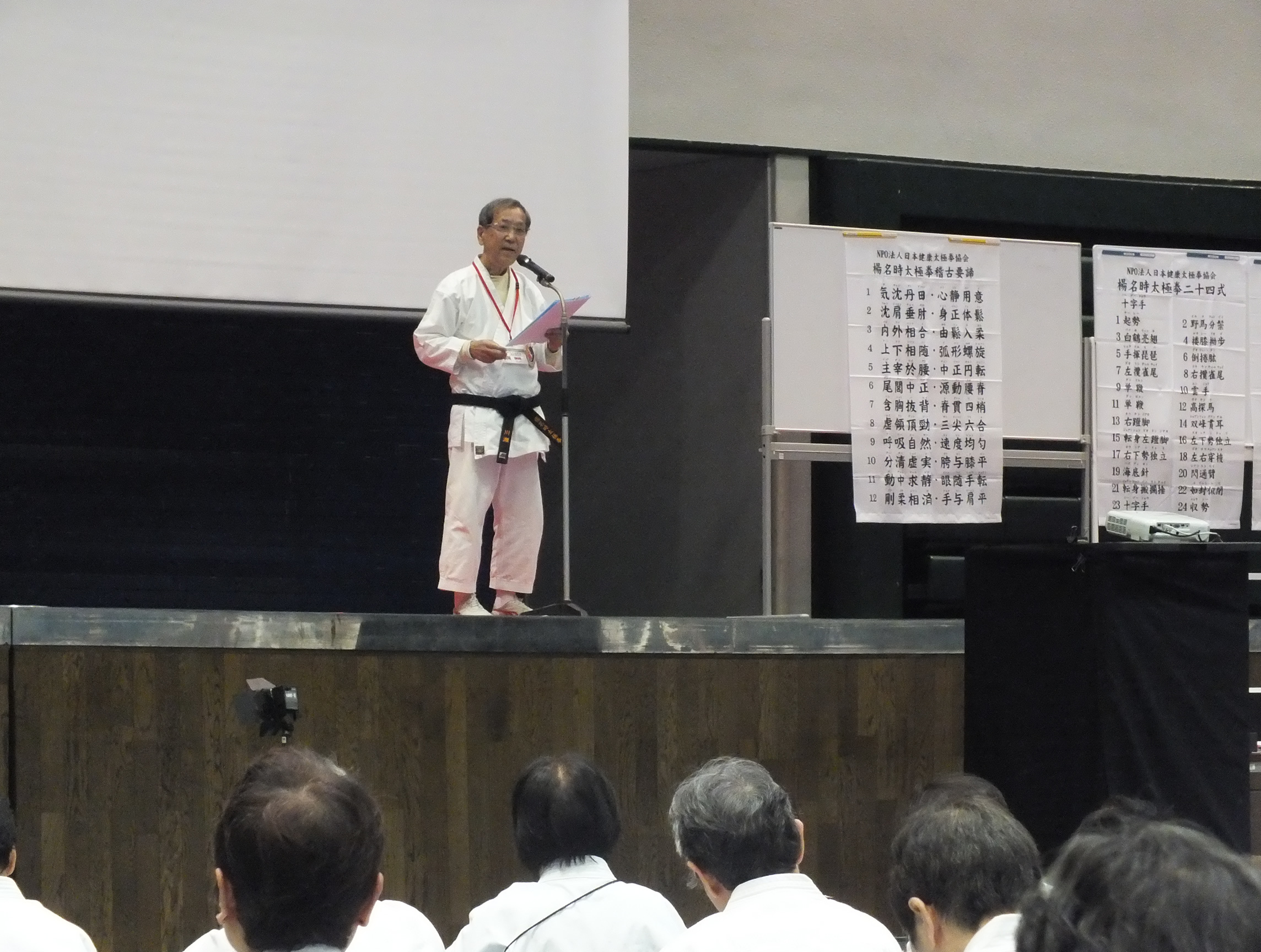 午後は、本部育成研修担当理事・長表師範の講話「楊名時太極拳を学ぶ」、続いて楊慧先生から「指導者としての心構え」についてスクリーンを使って講義していただきました。