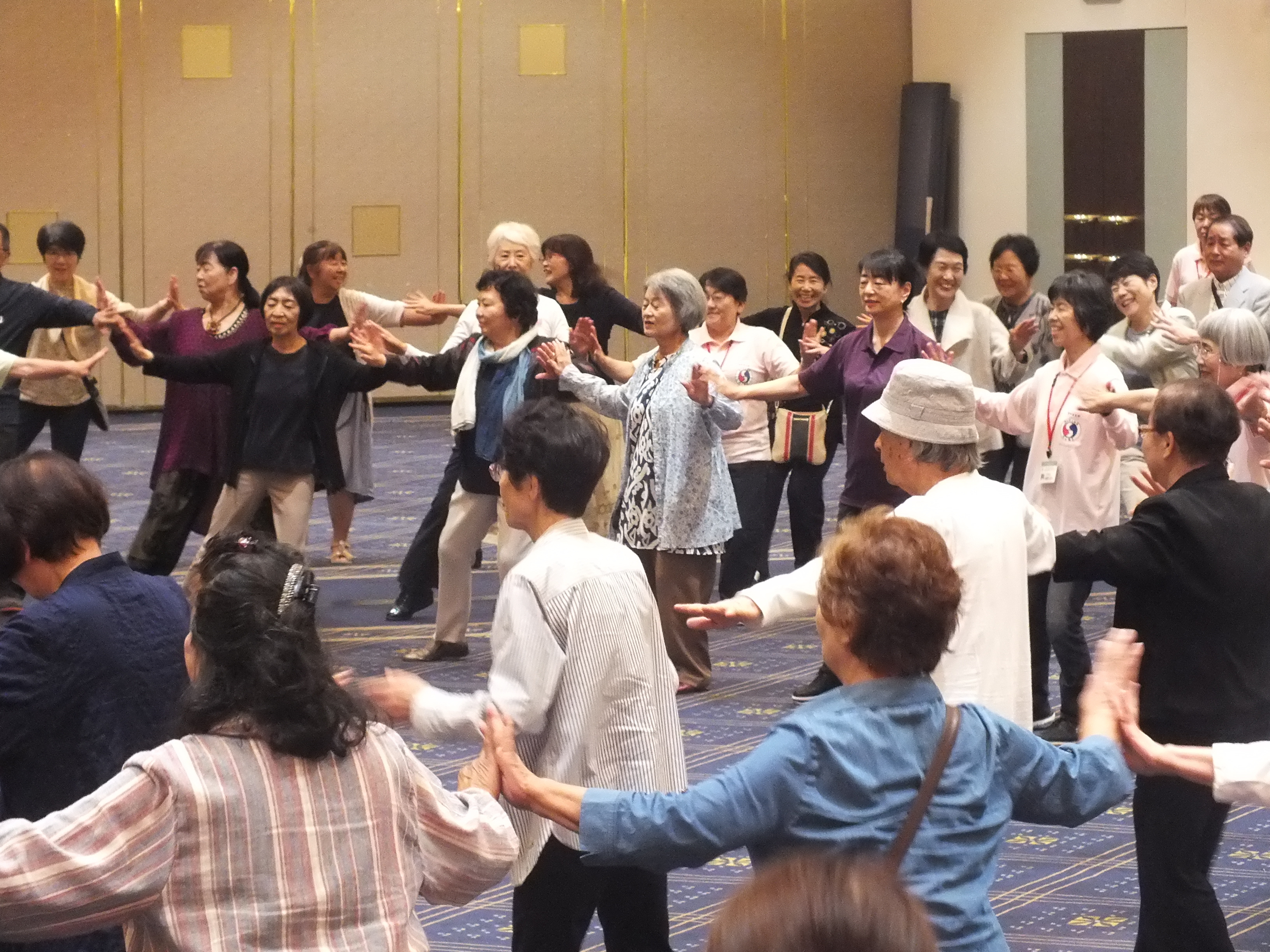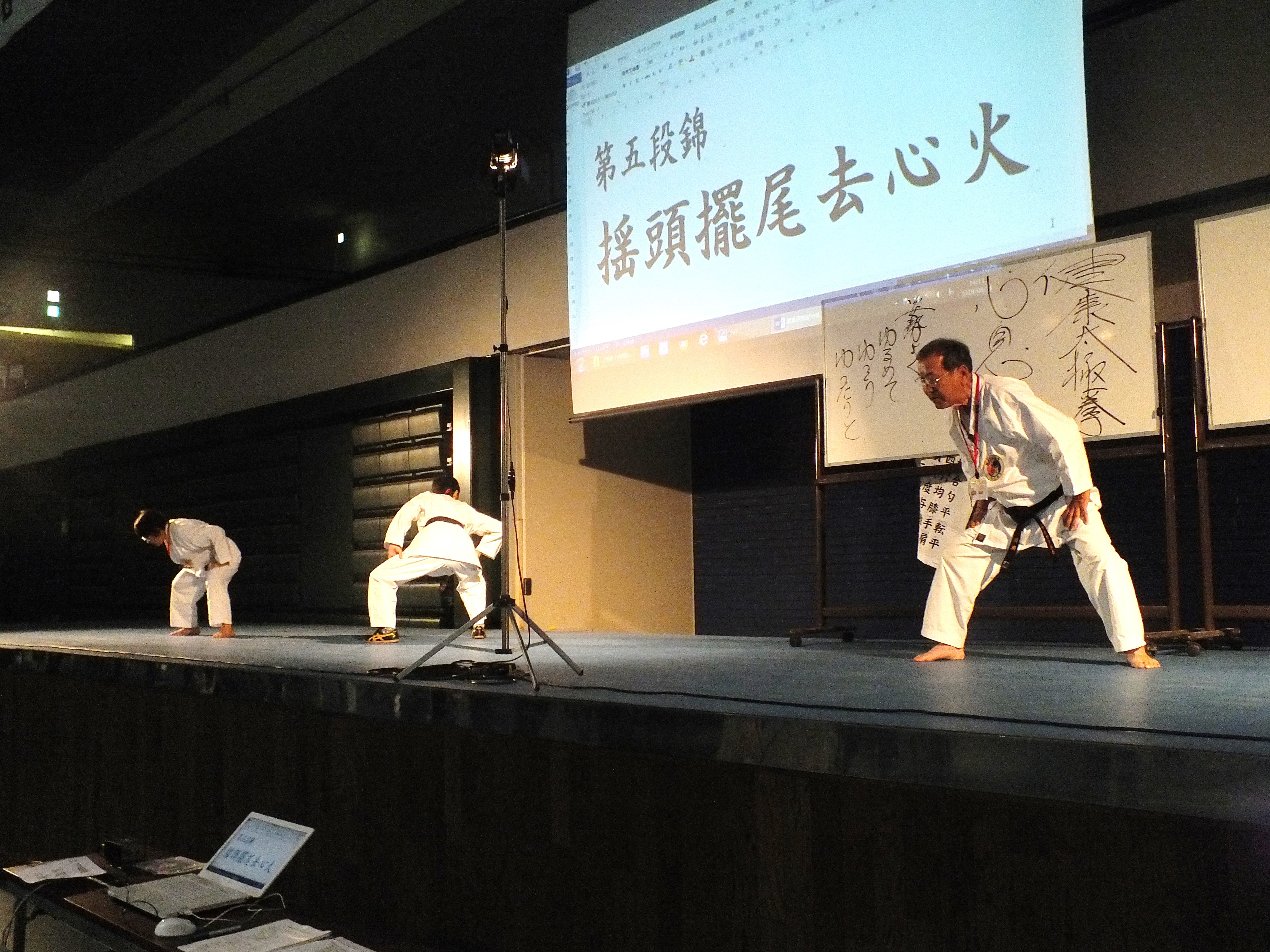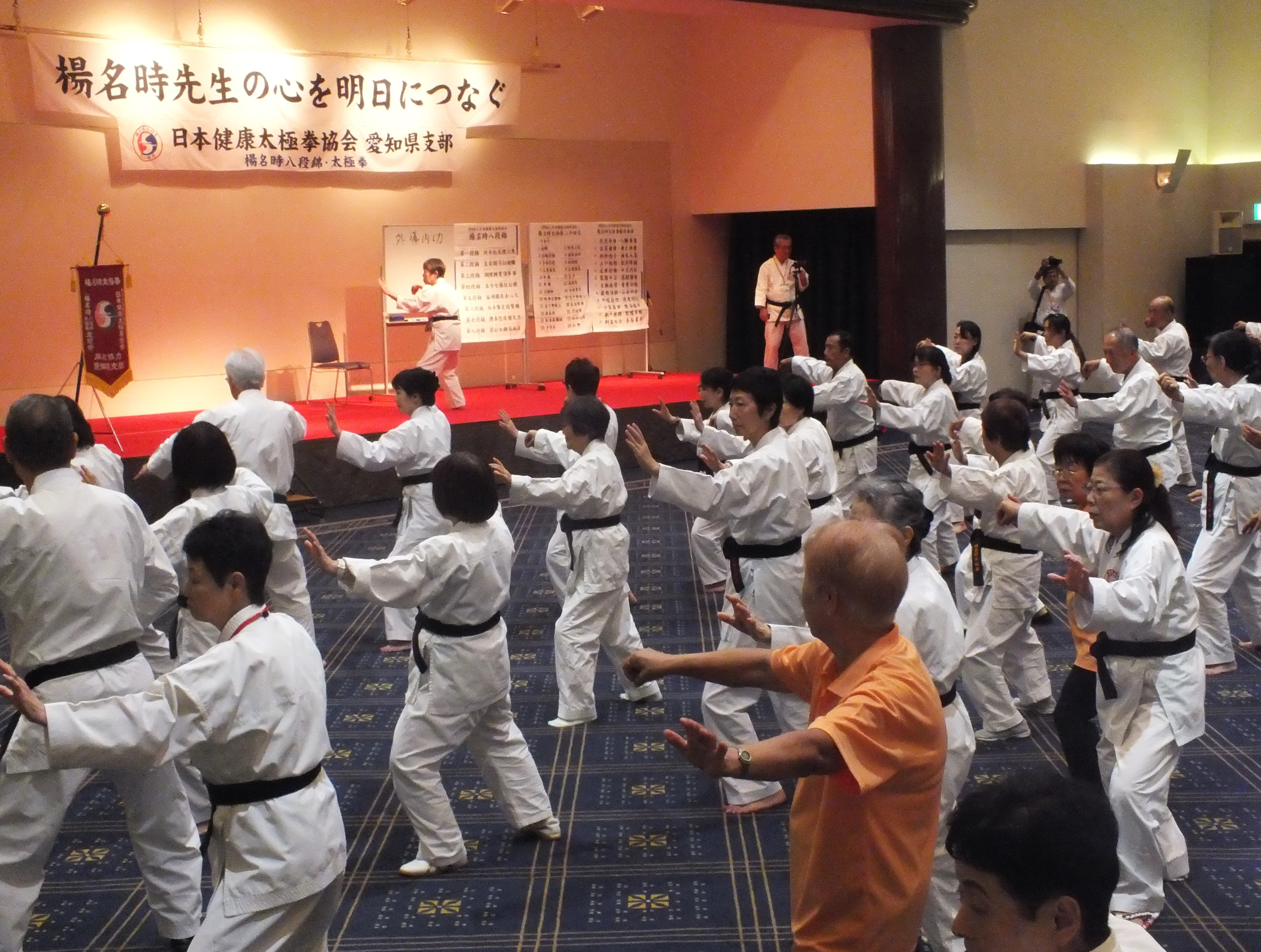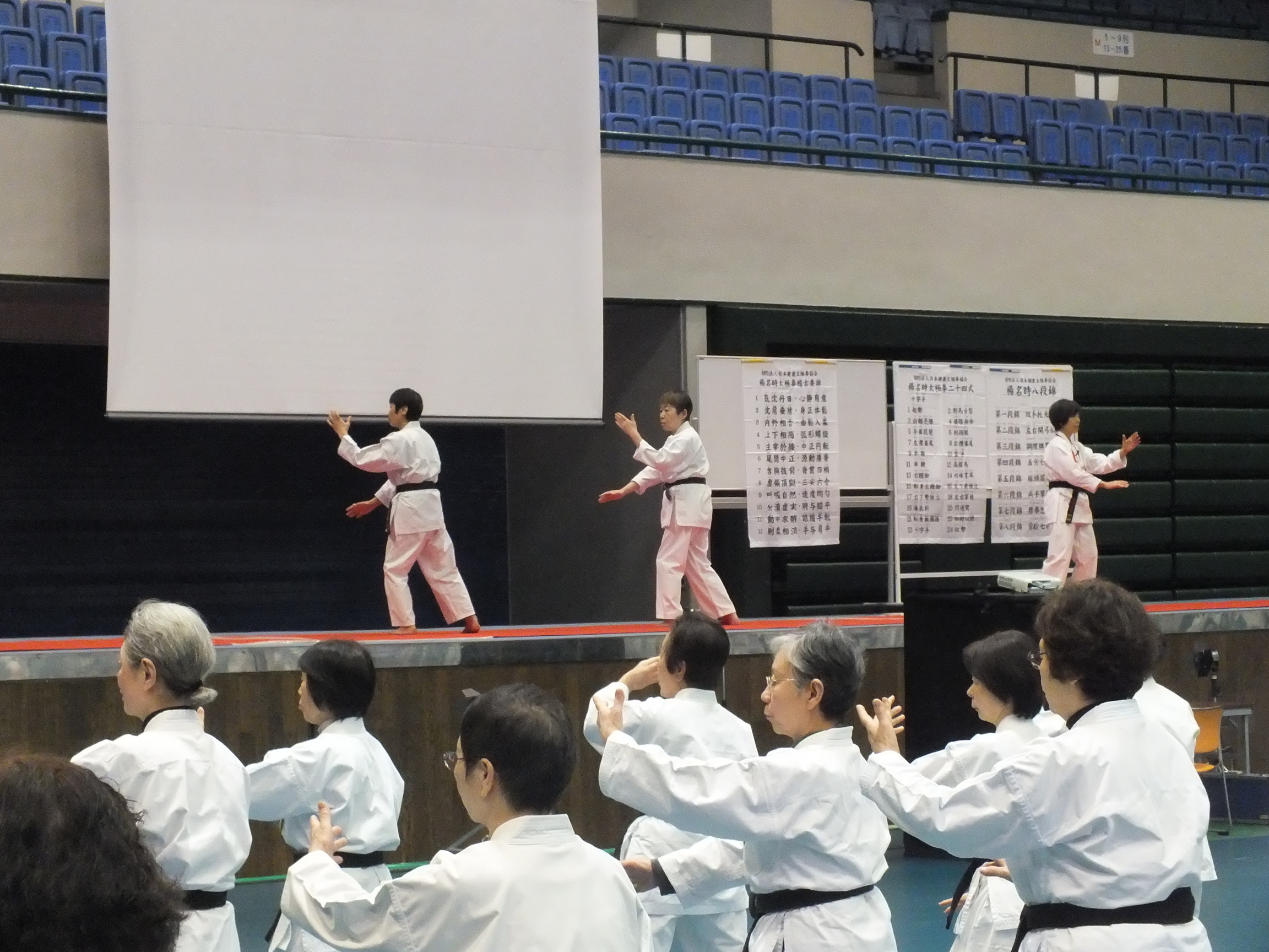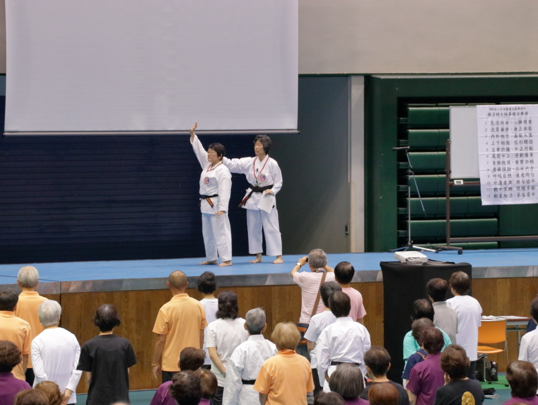 一日目、全体稽古の後、楊慧先生による「楊名時八段錦(その4)」の特別講習会が行われました。今回は第七段錦と第八段錦を、わかりやすく丁寧に解説していただきました。その後教室指導者の演舞があり、最後に全員で「太極之華」を演舞しました。