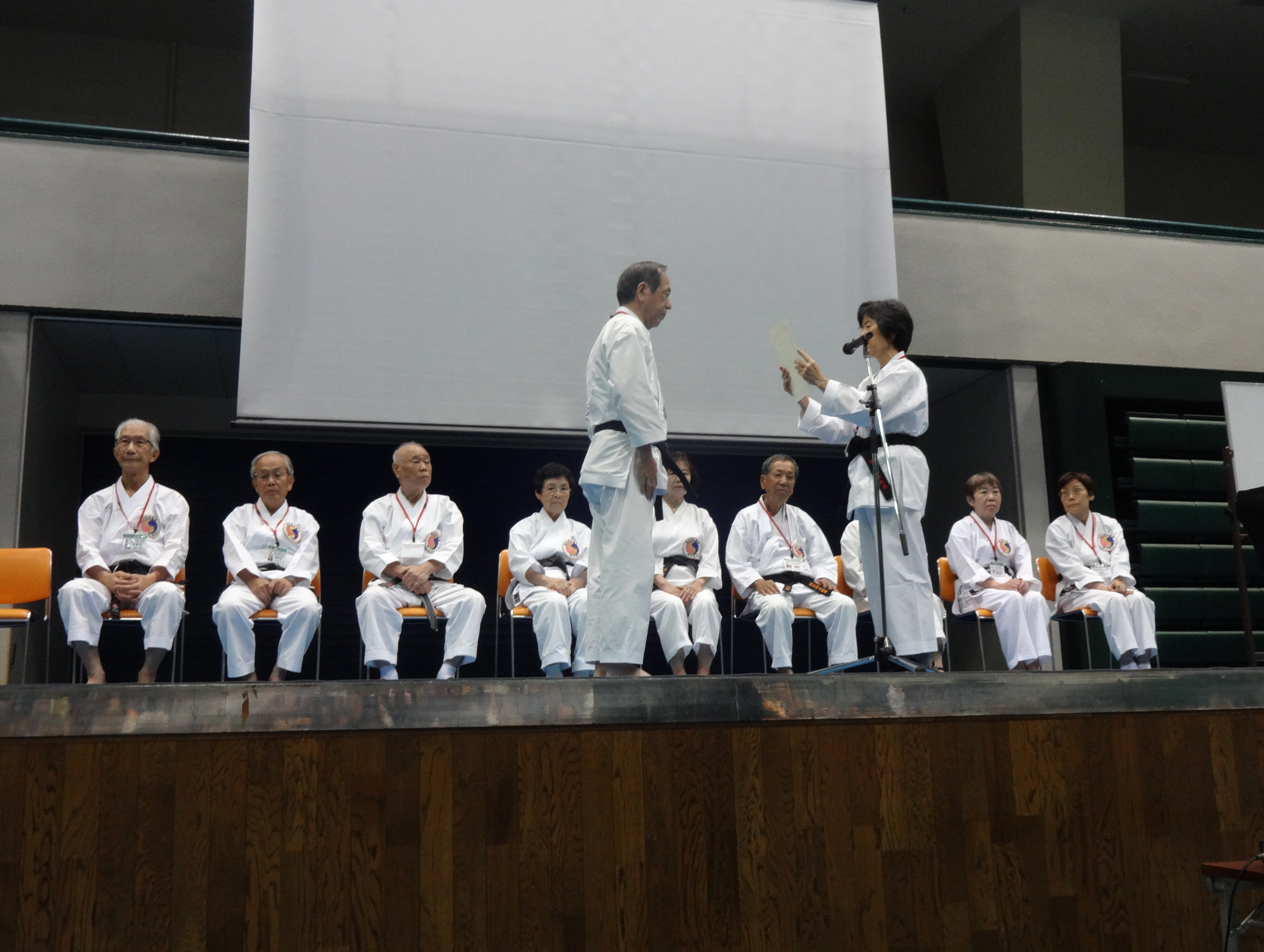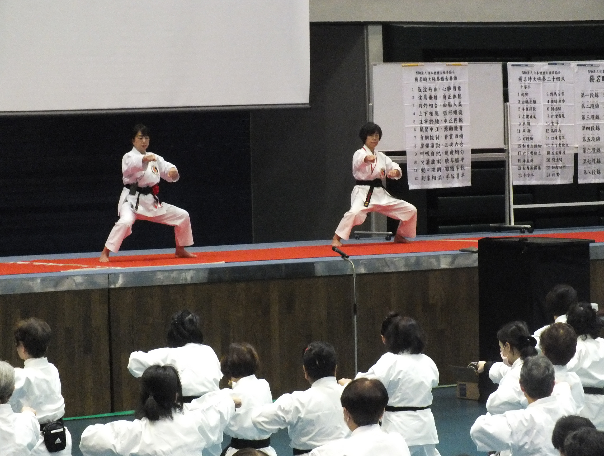 午後は「基本を学ぼう」というテーマで、3人の師範により「楊名時太極拳を楽しむ」、「八段錦」、「稽古要諦と太極拳」について、それぞれお話及び実技研修がおこなわれました。太極拳演舞は二組に分かれての実施となりました。今年は楊名時八段錦・太極拳友好会が、日本健康太極拳協会と法人化されて二十周年となります。昼休憩時に記念式典・祝賀会の模様がDVDで紹介され、午後、記念の特別功労賞・永年功労賞の表彰がおこなわれました。