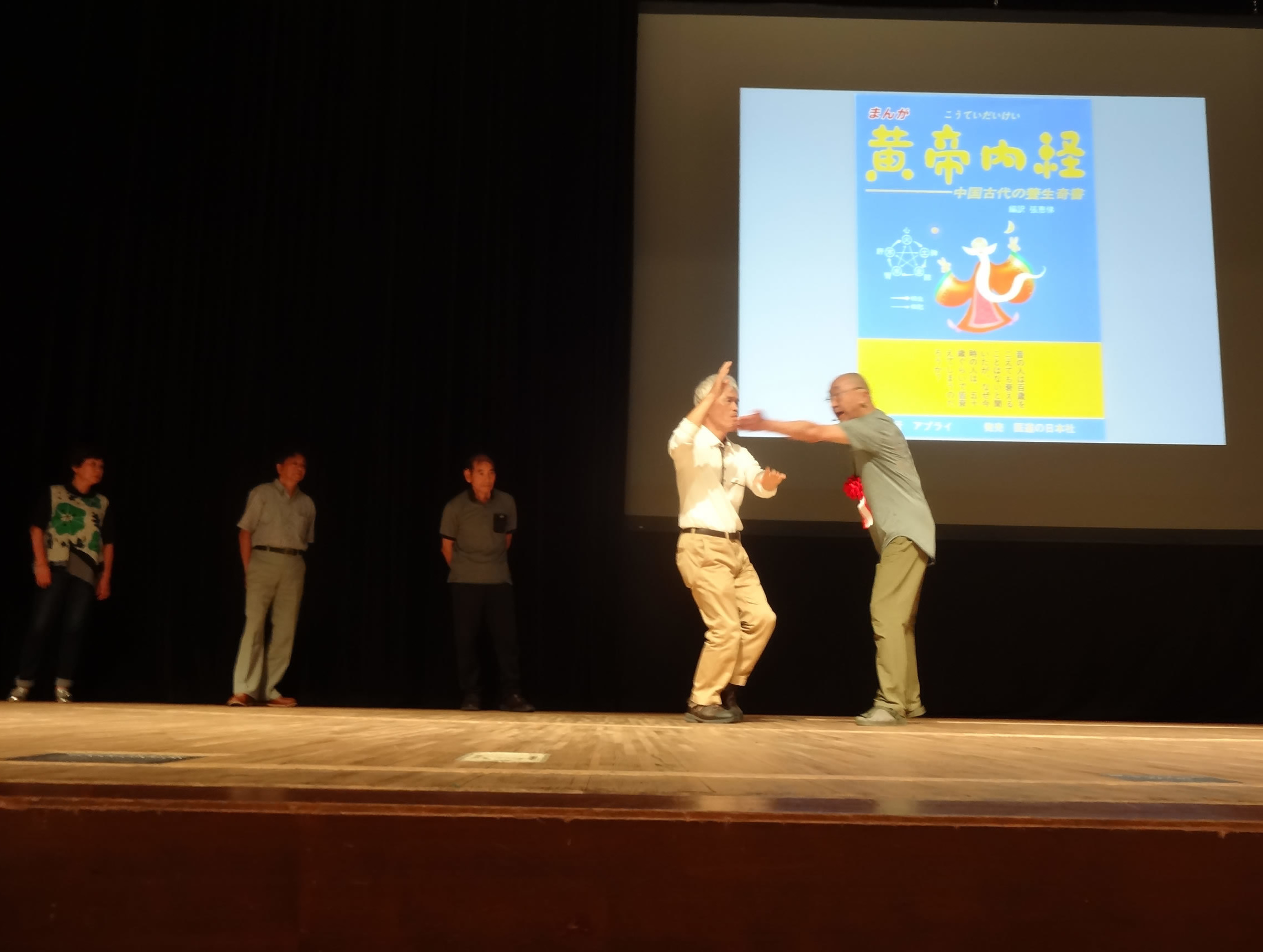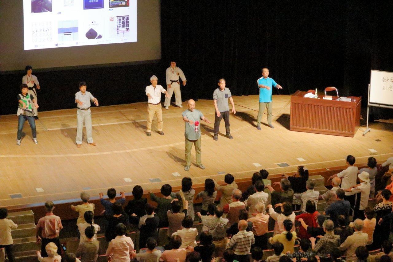 講習の初めに、参加者の中から選ばれた6名の代表と、支部役員3名・助手の方も加わって不老拳演舞がありました。登壇された7名を実技モデルとして、時々理事長の実技を交えながら解説していただきました。